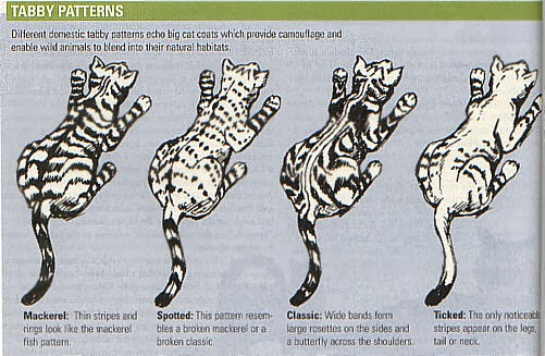 - kucing yang bercorak TABBY MACKERAL sering dirujuk sebagai Domestic Cat, Kucing Kampung, Kucing Biasa dan Kucing Jalanan.
